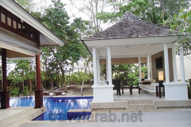 وأمام مبنى الإستقبال، حوض للسباحة. مُحاطٌ بأشجار الغابة وأمواج البحر. أما الفيلات المخصّصة للرواد في المنتجع، فهي عبارة عن بيوت مستقلّة موزّعة في أنحاء الغابة، تطلّ أبوابها ونوافذها على مشاهد متنوّعة للغابة الساحرة، والأثاث أنيق ومريح، والحمامات بلا جدران فالأشجار هنا هي التي تحجبُ وتستُر.. صمت عميق ومريح، حيث تستلقي أو تنام، يتخلَّله باستمرار، في الليل والنهار، تغريد الطيور التي تملأ أرض الجزيرة وفضاءها.​