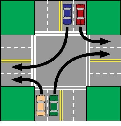 بما ان السيارة الزرقاء تريد الالتفاف الى اليمين فيجب عليها افساح الطريق امام السيارة الخضراء و ذلك بالتوقف في منتصف التقاطع و عدم اكمال الطريق الا بعد مرور جميع السيارات .