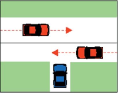 راقب الخطوط المتقطعة في الارض فهي تعني ان الاولولية لك و بذلك يجب على السيارة الزرقاء التوقف و افساح الطريق .