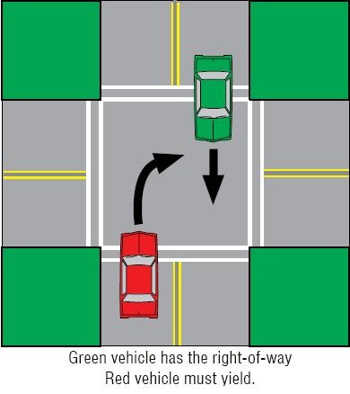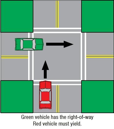 في هذا المثال ينبغي على صاحب السيارة الزرقاء التوقف و اعطاء الاولوية لمرور السيارة الخضراء .